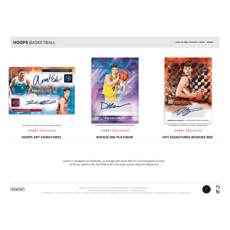 - Look for 1 Autograph per Hobby Box, on average! Also chase after On-Card-Autographs of some of the top rookies in the 2024 NBA Draft in the super popular Hoops Art Signatures!