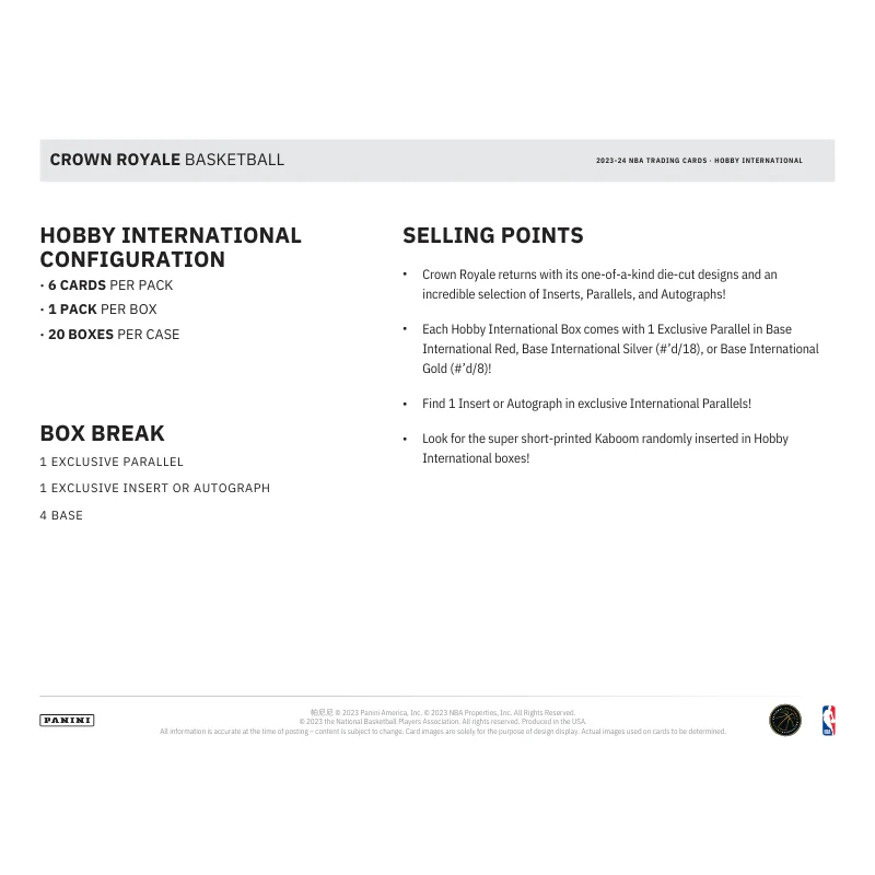 The 2023/24 Panini Crown Royal Basketball International Hobby Box brings a regal touch to basketball card collecting. Known for its unique die-cut designs and luxurious feel, this edition features an impressive lineup of NBA stars, rookies, and legends. Collectors can chase the iconic Crown Autographs, Silhouettes, and the exclusive Kaboom! inserts, which are sure to add immense value and excitement to any collection.